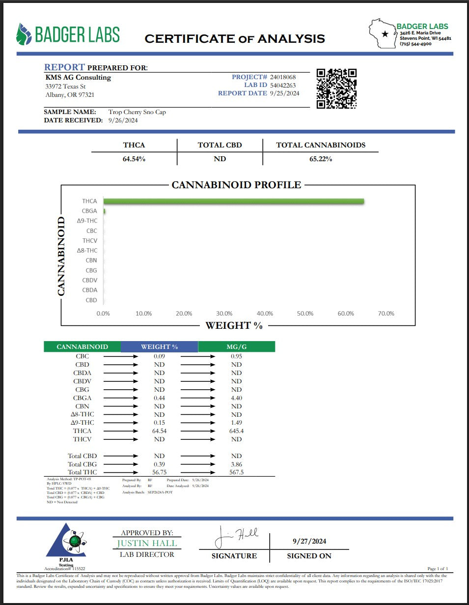 Testing at ~26% THCa, Trop Cherry Snow Caps is perfect for connoisseurs, extractors, and anyone who wants top-tier exotics in small-bud form — at a fraction of the price, but all of the flavor.